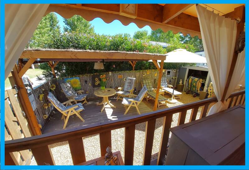 Auf der gemütlichen Außenterrasse (mit Sonnenblumendekor verziert) des Mobilheims, auf der Sie in der Sonne sitzen oder liegen können, befindet sich auch ein Schuppen, auf dem noch alles Mögliche liegt.